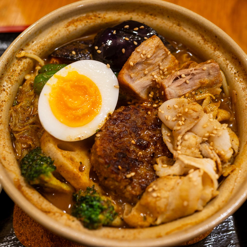 ハンバーグと角煮と豚しゃぶが入って盛りだくさんのカレー屋 きいろさんの「肉ざんまいのスープカリー」