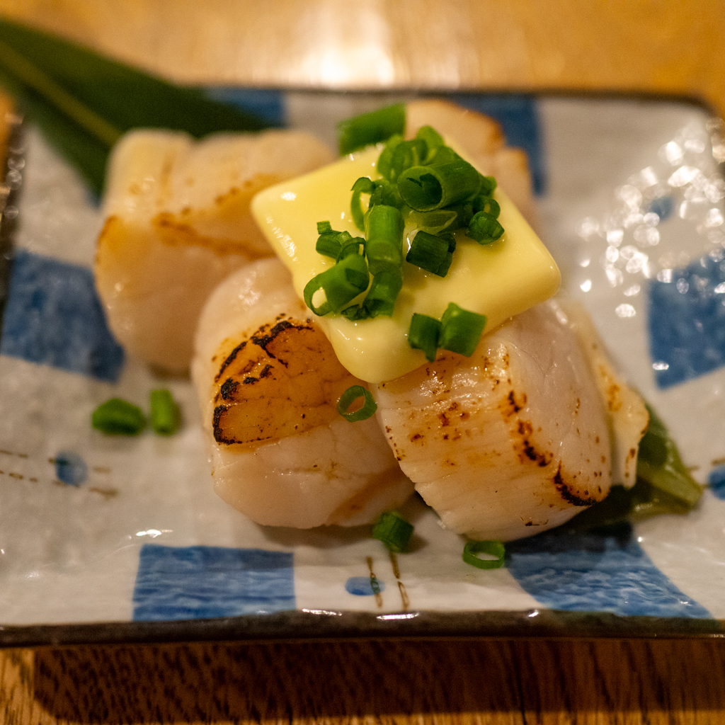 刺身用のホタテを炙ってもらう贅沢で。