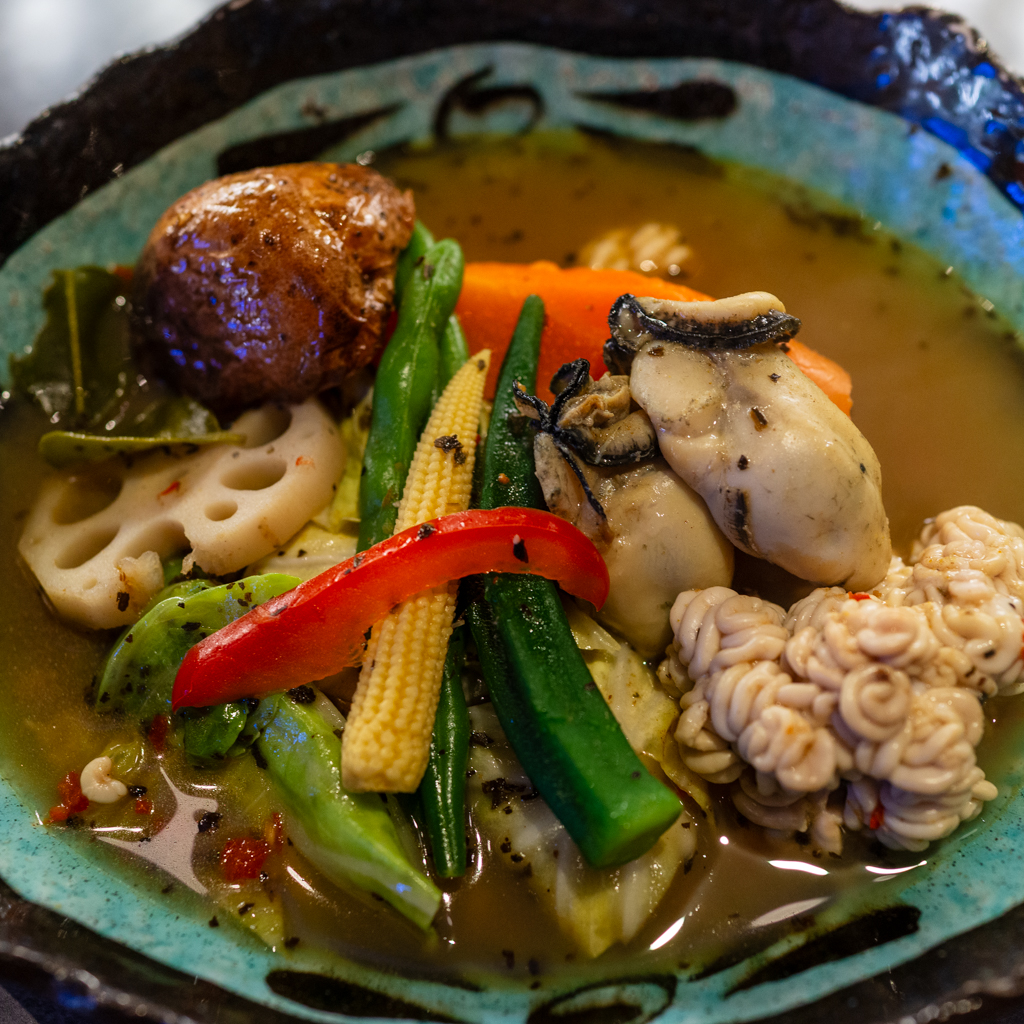 癖強いスープカレーが食べたくなってきたのでSHANTiさんに行ってきました。今日は「ホタテとかき」だろうと思ってモバイルオーダで注文すると、お店の方に今日はタチと牡蠣がありますよと言われたので即オーダ変更。