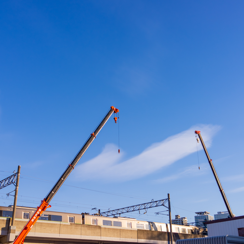 朝の光景なんですけど。なんかクレーン二台がミラーに写したみたく並んでいたのでおもわずニヤニヤしながらパシャリ。